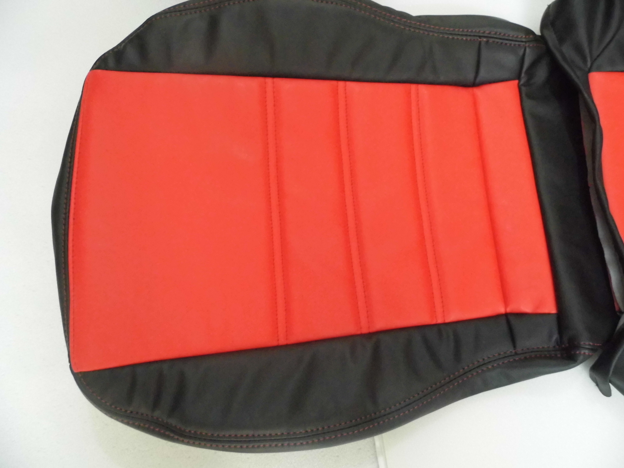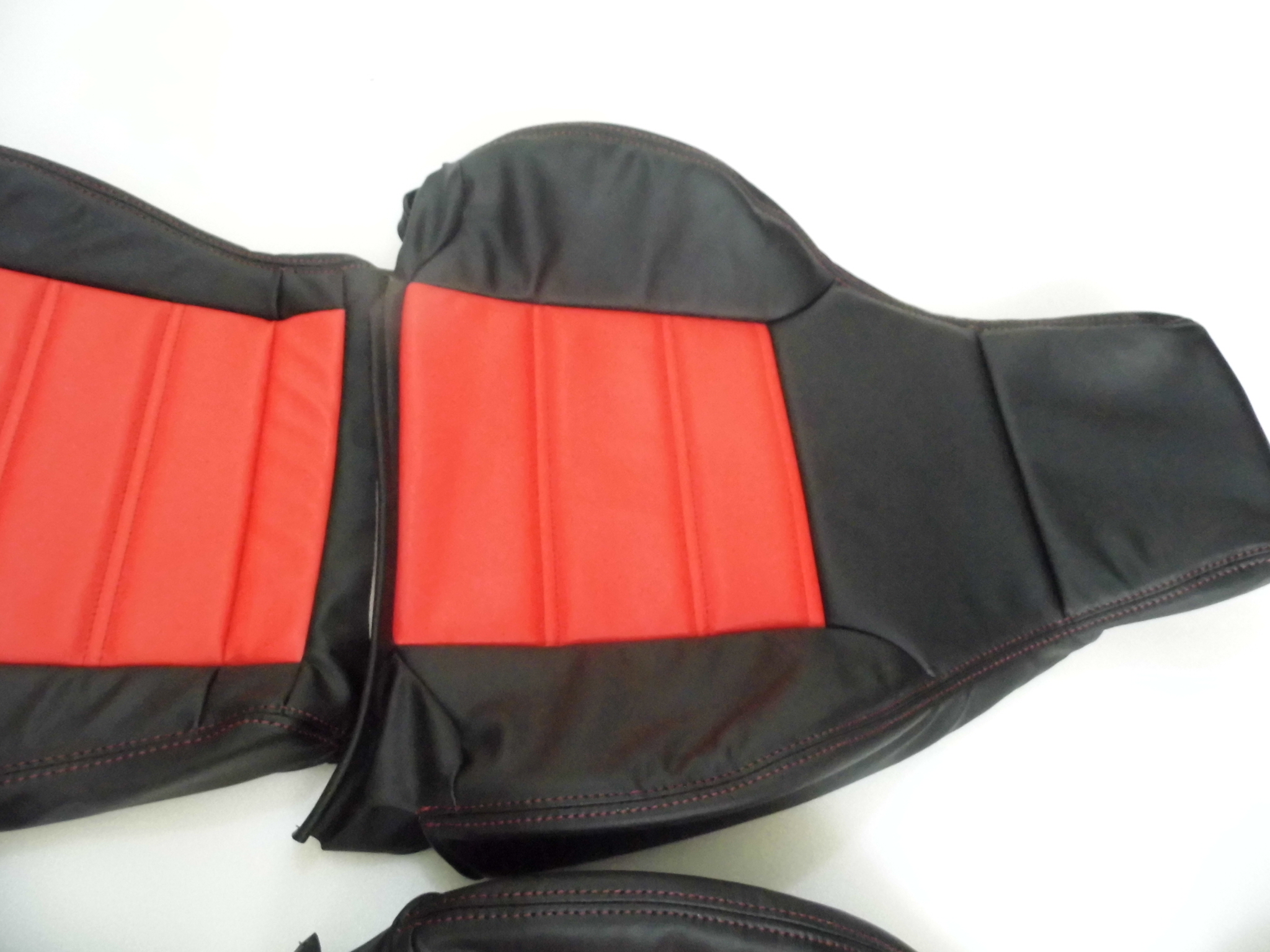 The price is for front pair of seat covers consisting of 2 headrests, 2 back covers, and 2 bottom covers in black synthetic leather with red inserts, black stitching.