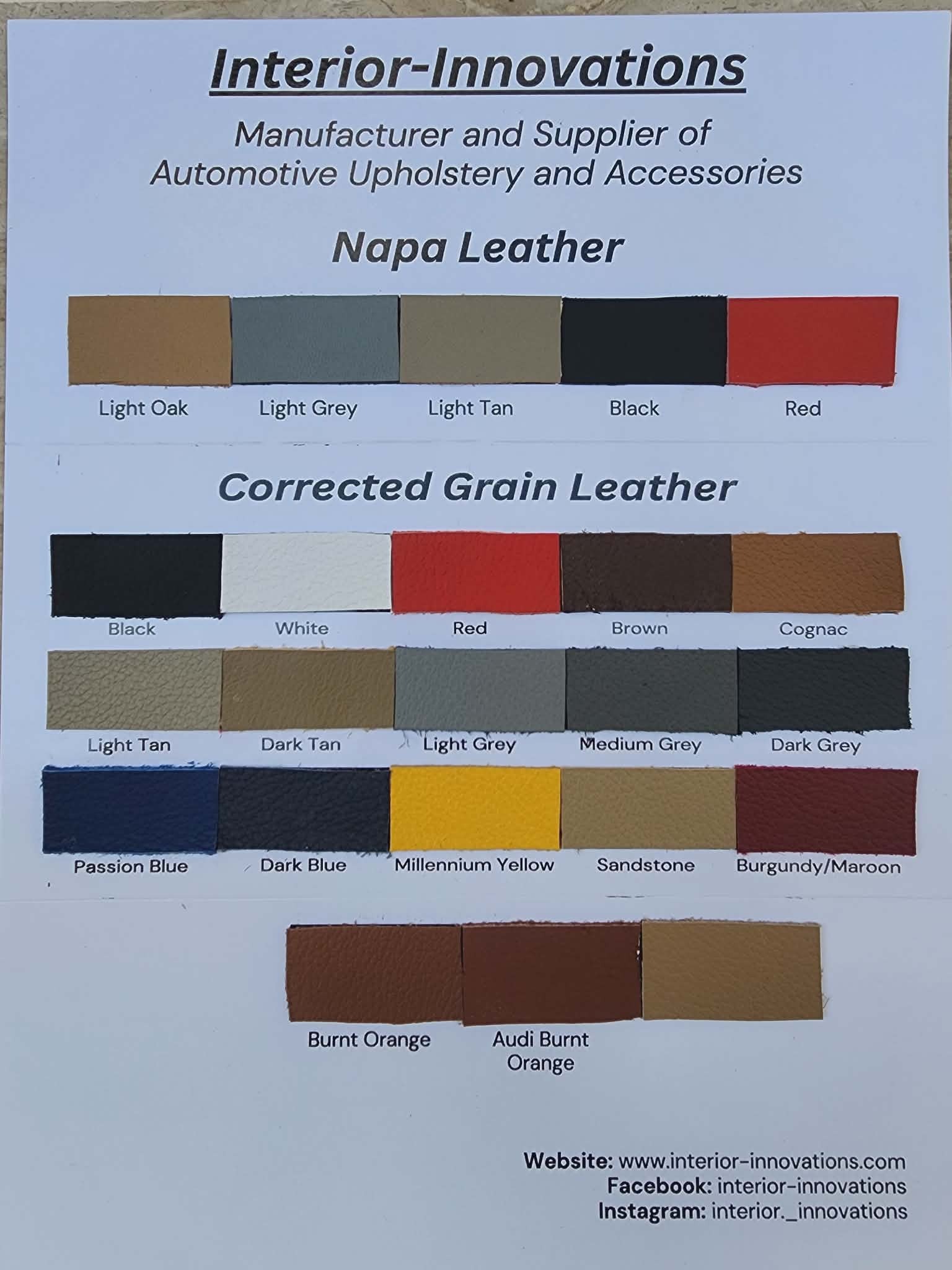 Leather sample card with both corrected and full grain leather samples.
